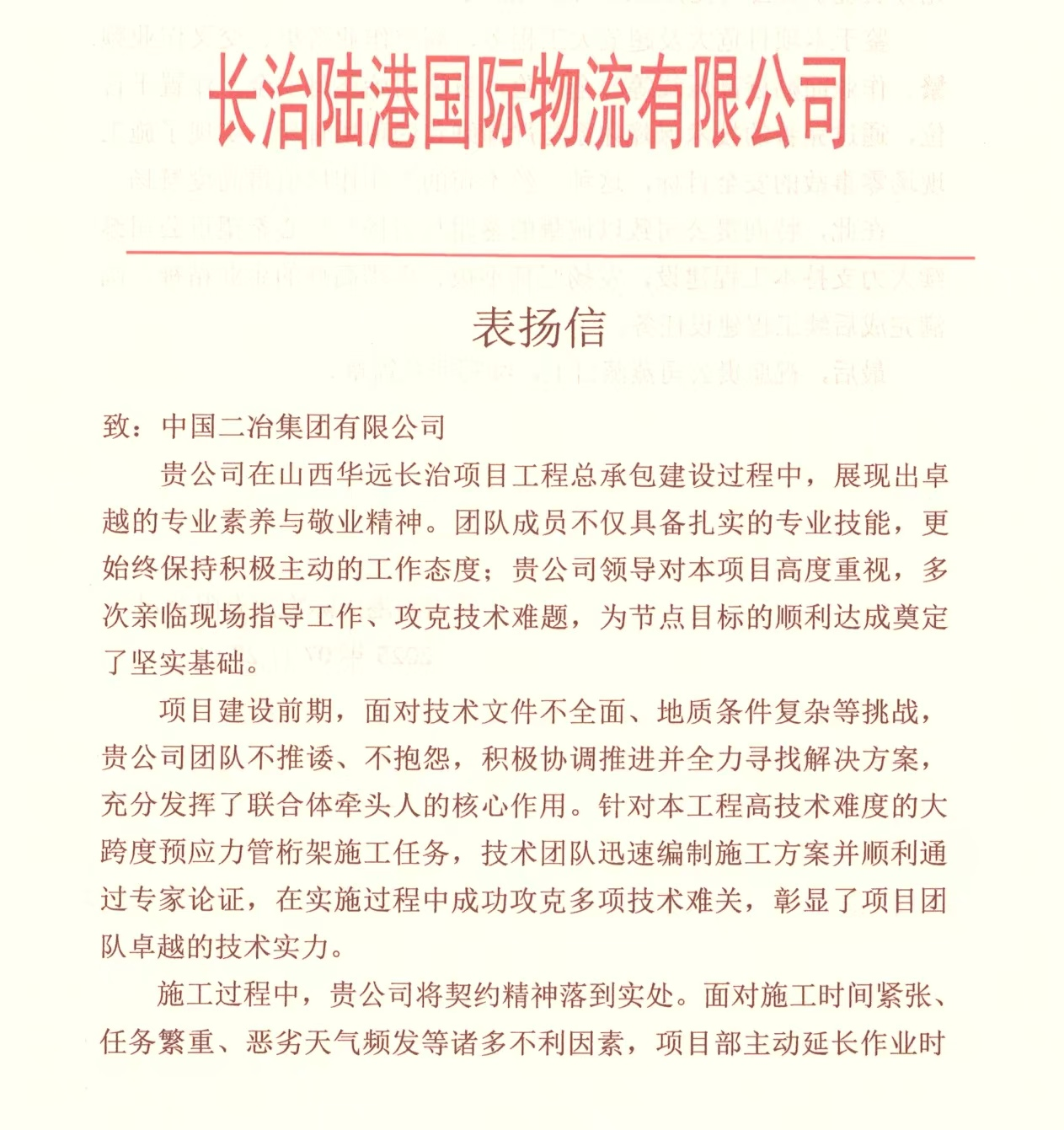 7月23日,中國二冶收到來自長治陸港國際物流有限公司表揚信。對中國二冶鋼構公司山西長治項目管理團隊攻堅克難,順利實現項目既定目標提出表揚。